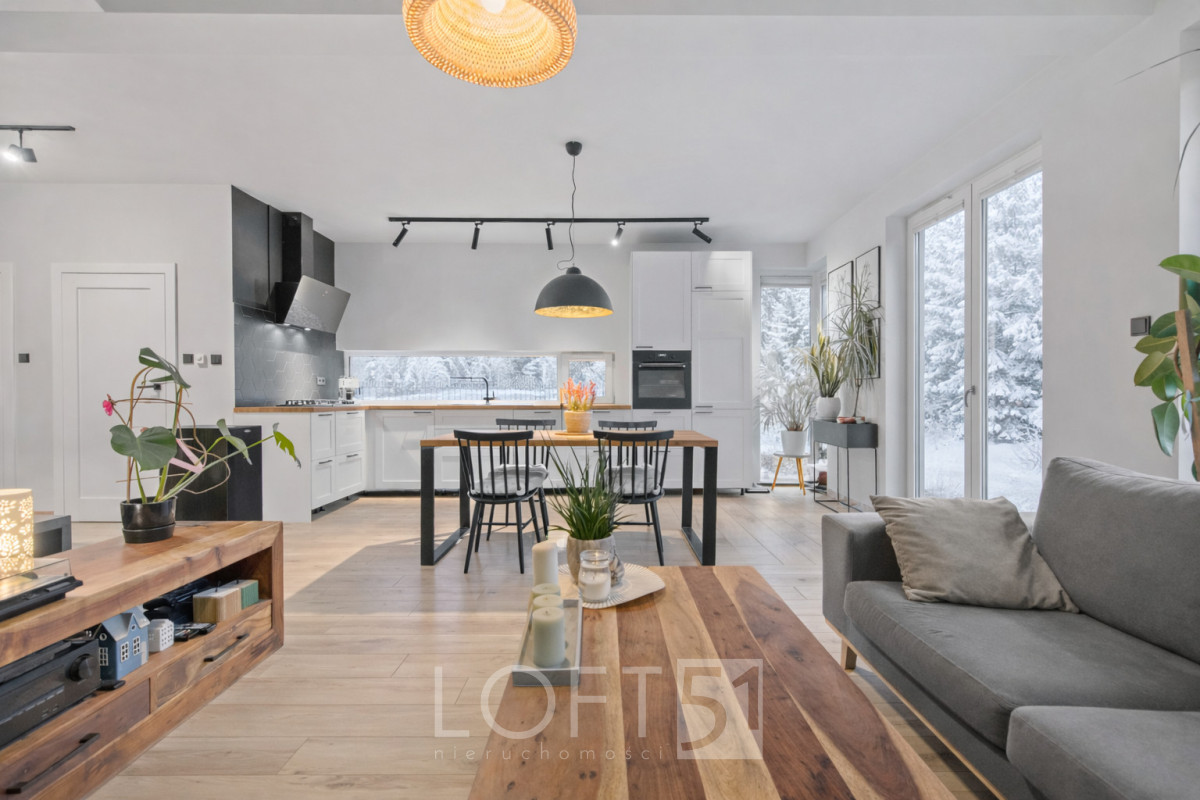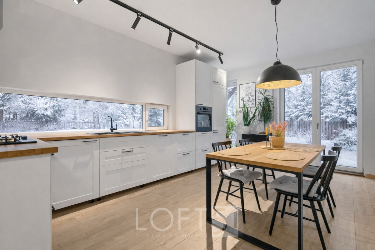 • Widna kuchnia otwarta na jadalnię, z pięknym widokiem na ogród,
