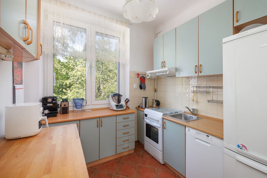 - Oddzielna kuchnia, z której rozpościera się widok na zieleń.