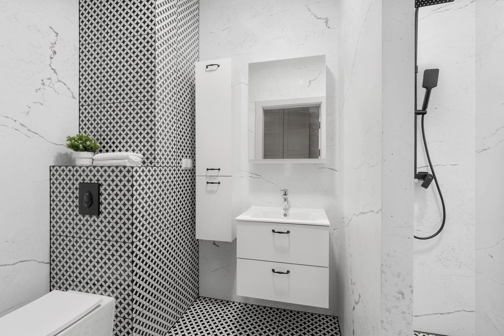 3) Łazienka – eleganckie, nowoczesne oświetlenie, nowa armatura i ponadczasowy styl.