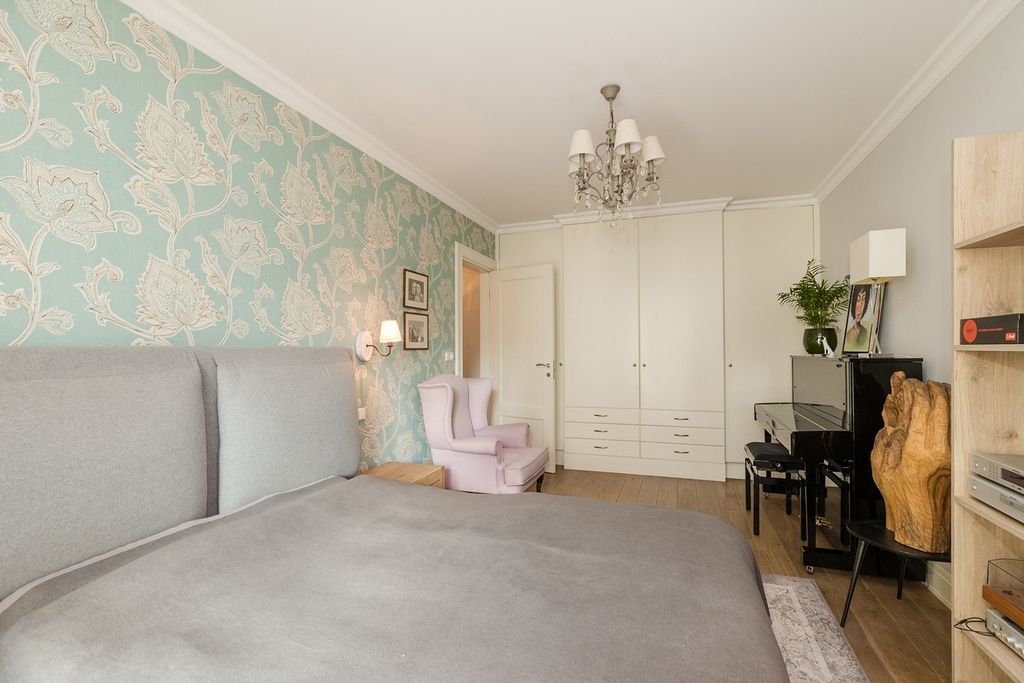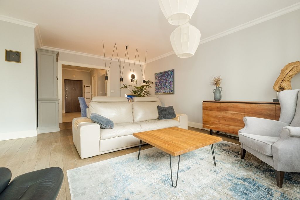 O wysokim standardzie wykończenia świadczą: klasyczna drewniana podłoga, stylowa sztukateria przy suficie oraz wysokie listwy przypodłogowe.