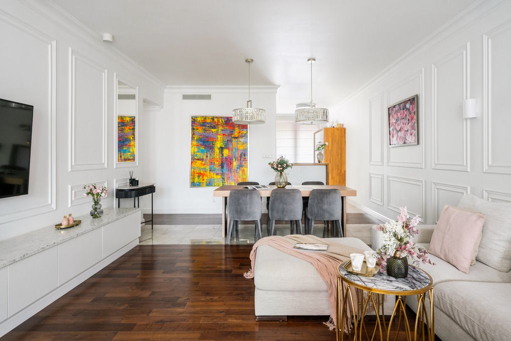 Mieszkanie jest gotowe do zamieszkania – wykończone materiałami wysokiej klasy, z centralną klimatyzacją i dużą ilością zabudów na wymiar.