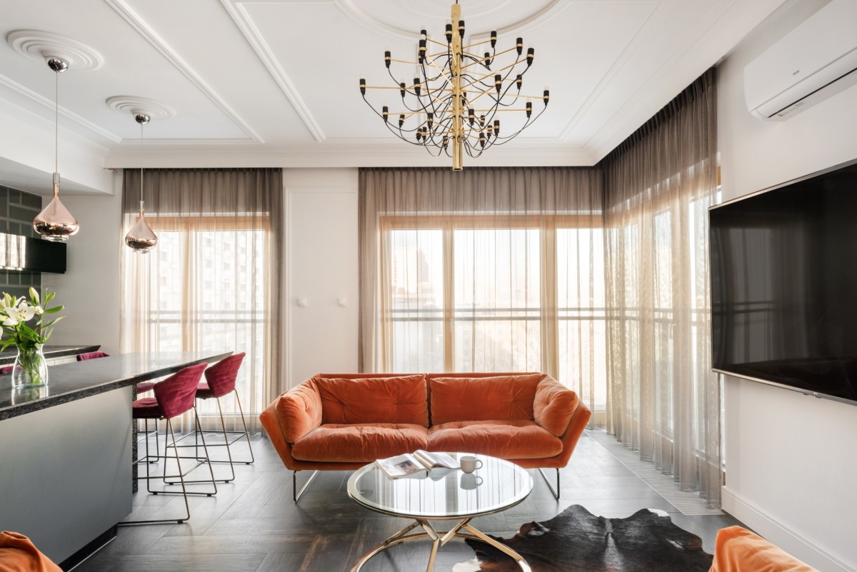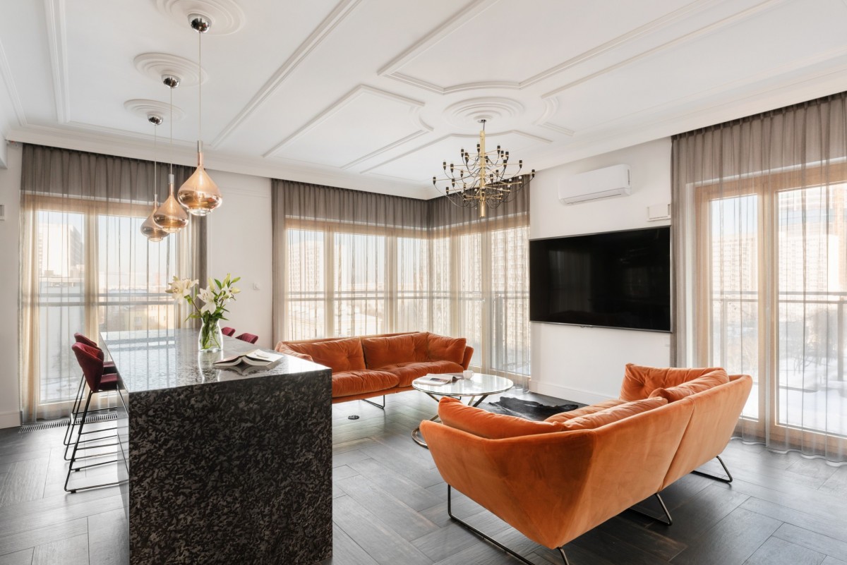 The apartment is corner-positioned, fully furnished and equipped, designed in an elegant modern glamour style, with meticulous attention to the highest finishing standards and acoustic comfort. Large floor-to-ceiling windows provide excellent natural light and enhance the sense of space.