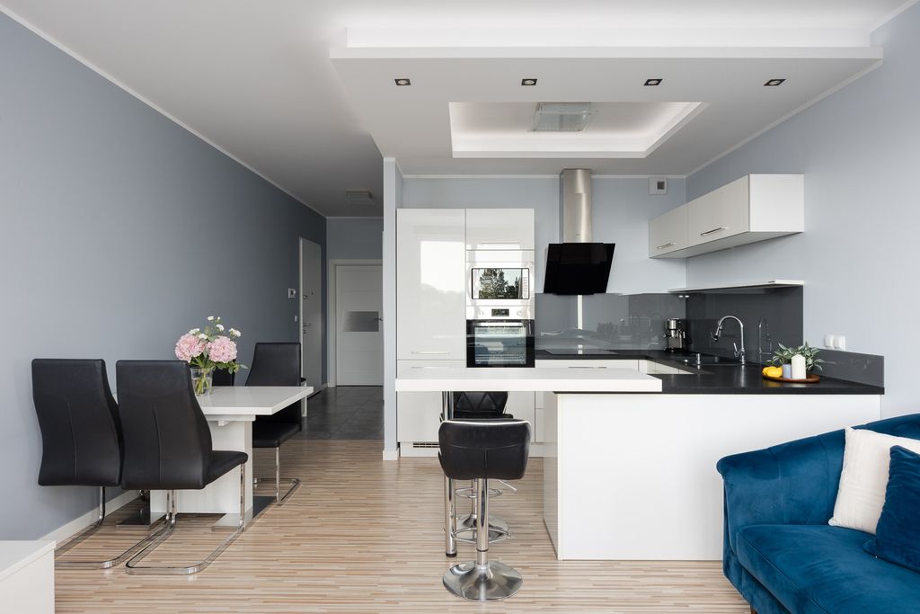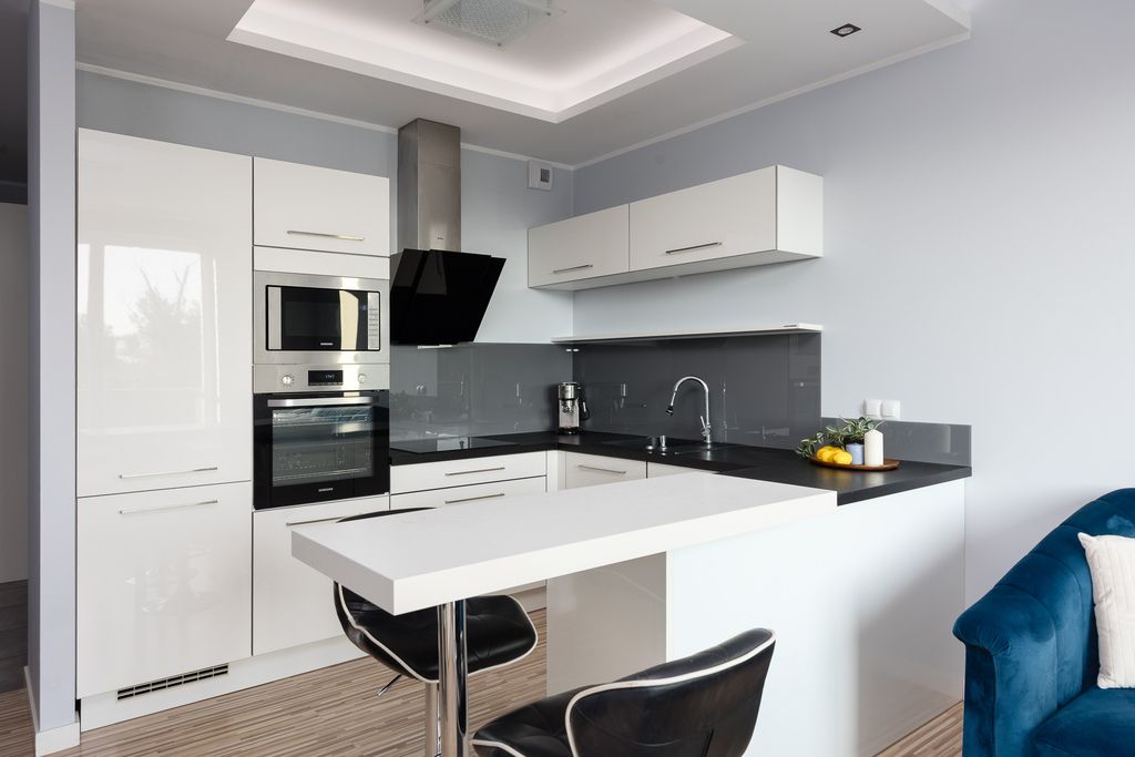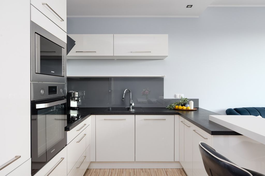 Kuchnia zaprojektowana na wymiar oferuje liczne szafki w zabudowie, zapewniające dużo miejsca do przechowywania, oraz pełen zestaw wysokiej jakości sprzętów AGD: zmywarkę, lodówkę z zamrażarką, płytę indukcyjną, piekarnik, mikrofalówkę i okap. Aneks kuchenny wyposażono w meble niemieckiej marki SachsenKüchen, które łączą funkcjonalność z eleganckim designem.