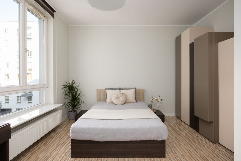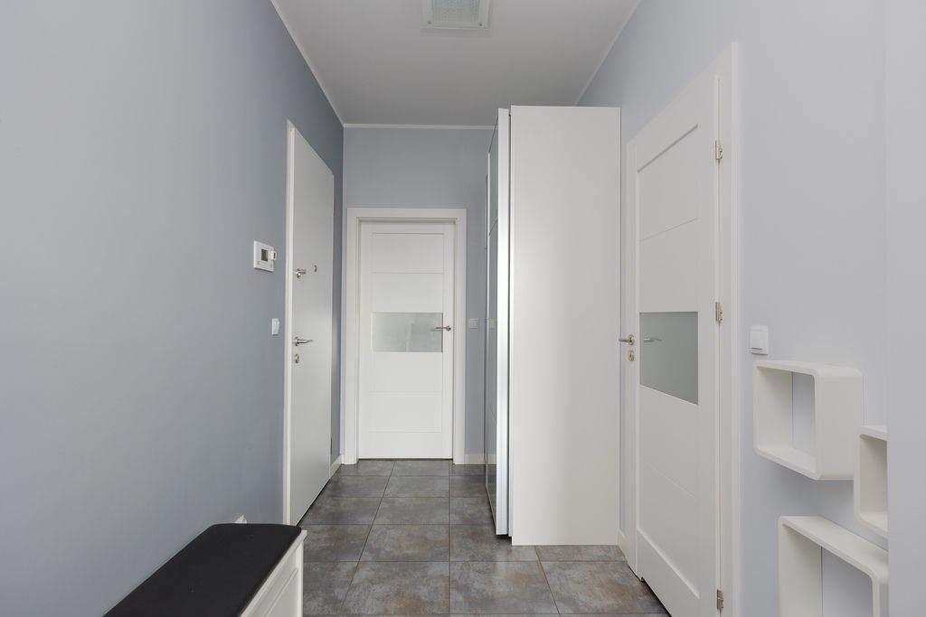 Wnętrze mieszkania utrzymane jest w stonowanej, neutralnej kolorystyce, co pozwala na swobodną aranżację i łatwe dopasowanie do różnych gustów. Podłogi wykończono panelami oraz gresem, nadając całości nowoczesny i ponadczasowy charakter.