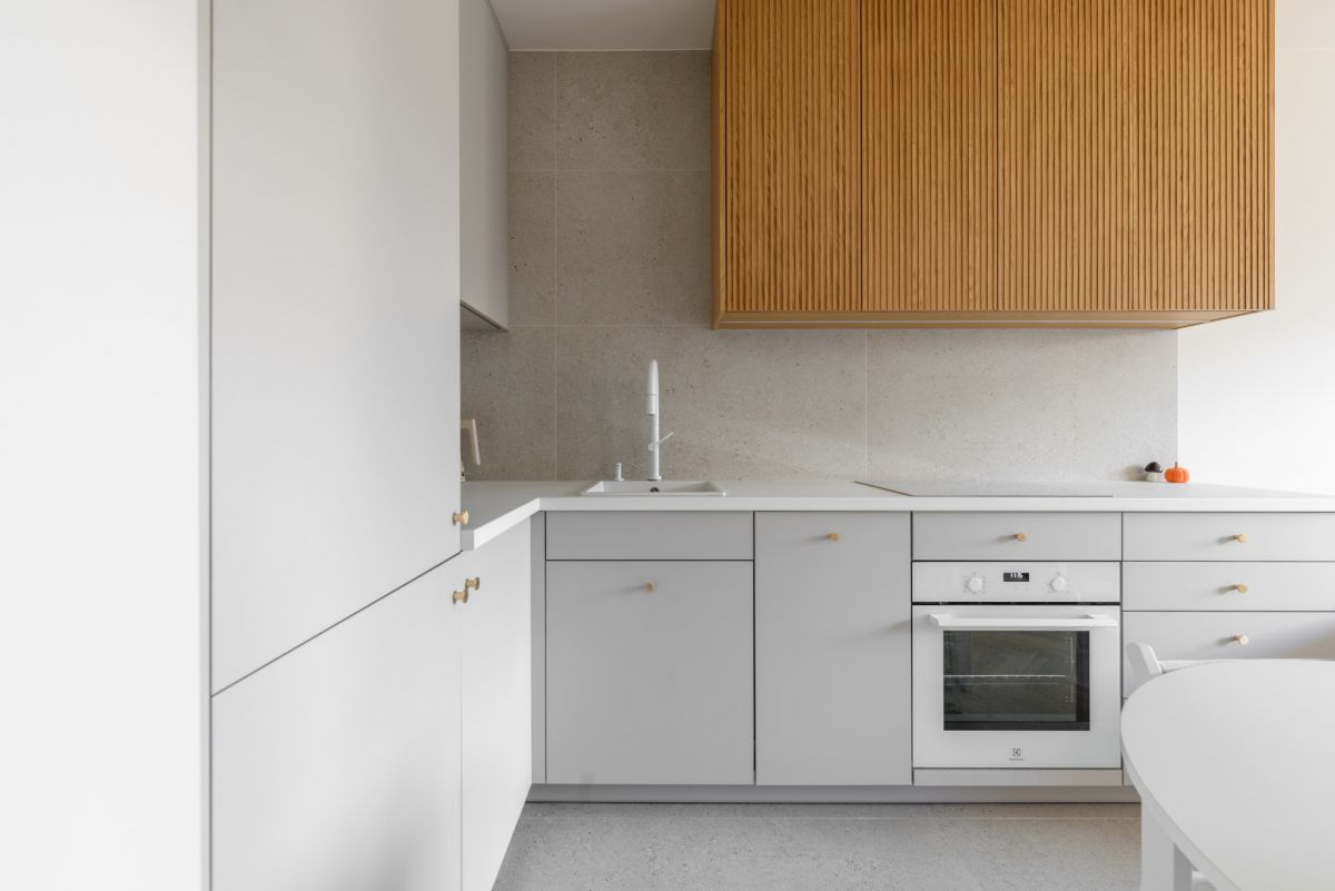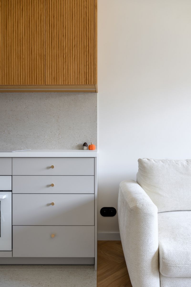 Wnętrze zostało wykończone w wysokim standardzie - meble wykonano na wymiar przez stolarza, z zastosowaniem trwałych i nowoczesnych materiałów. Całość dopełnia drewniana podłoga, podkreślająca naturalny charakter przestrzeni.