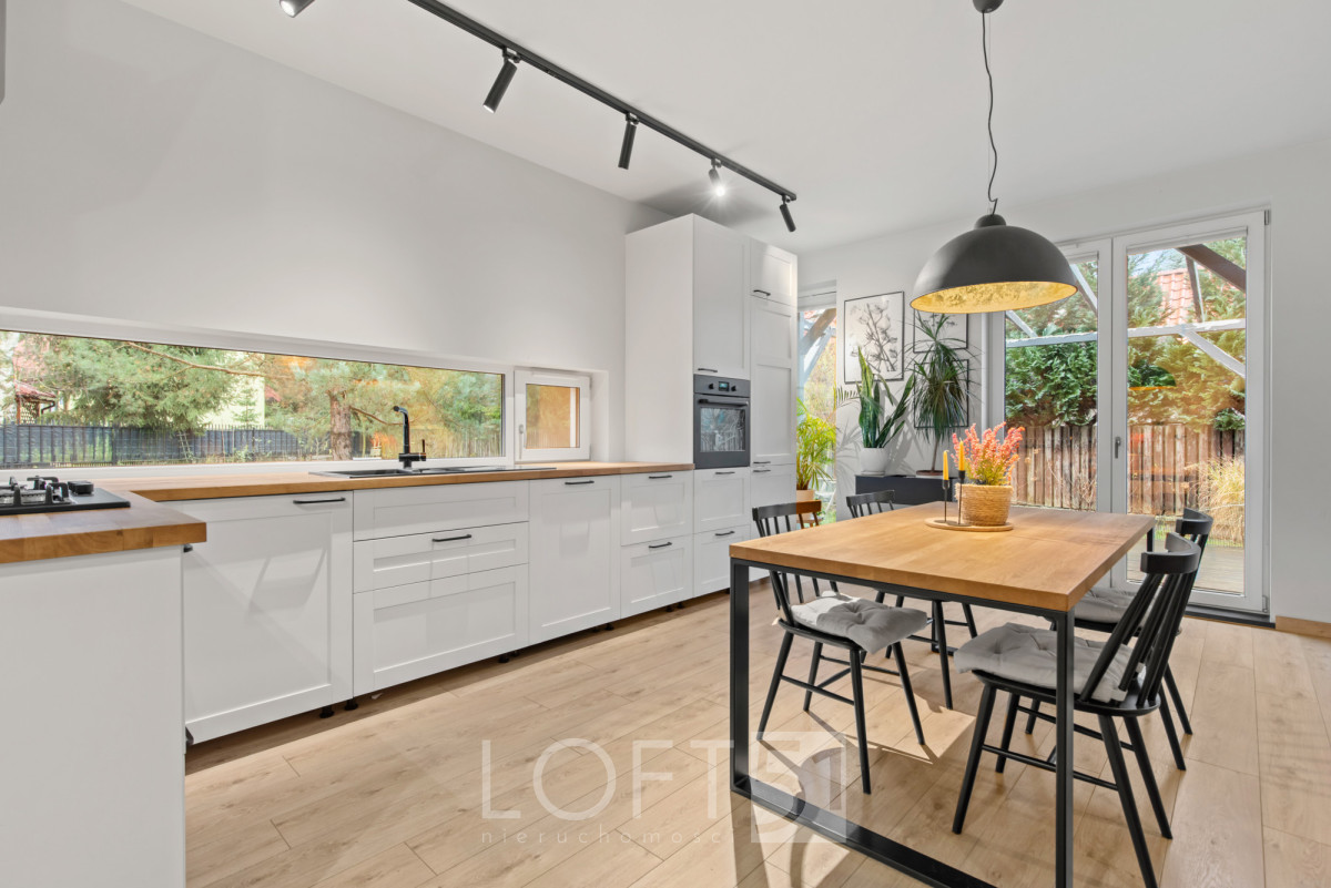 • Widna kuchnia otwarta na jadalnię, z pięknym widokiem na ogród,