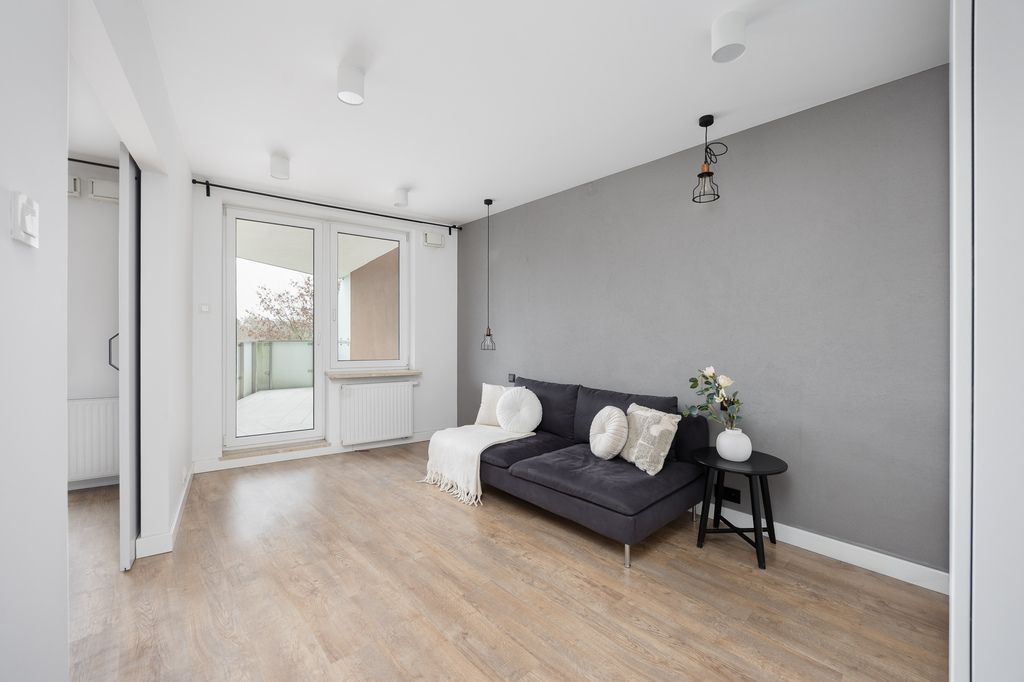 Wysoka na 2,6m nieruchomość charakteryzuje się otwartym planem z salonem i aneksem kuchennym wyposażonym w wyspę oraz charakterystyczny, czarny okap. Część dzienną od sypialni oddzielają białe, przesuwne drzwi, a podłogi wykończono panelami w kolorze naturalnego drewna i ciemnymi kaflami. Wnętrze jest jasne dzięki dużym przeszkleniom balkonowym i utrzymane w kontrastowej, czarno-białej kolorystyce.