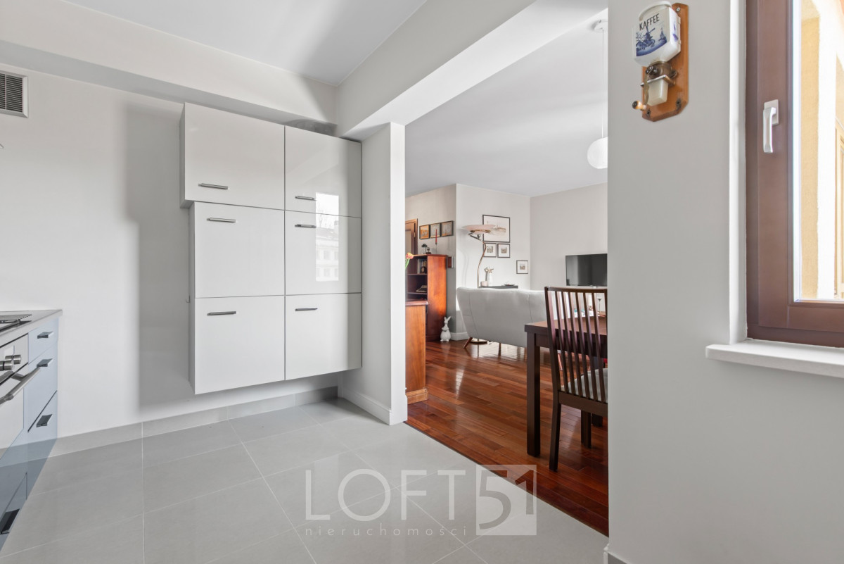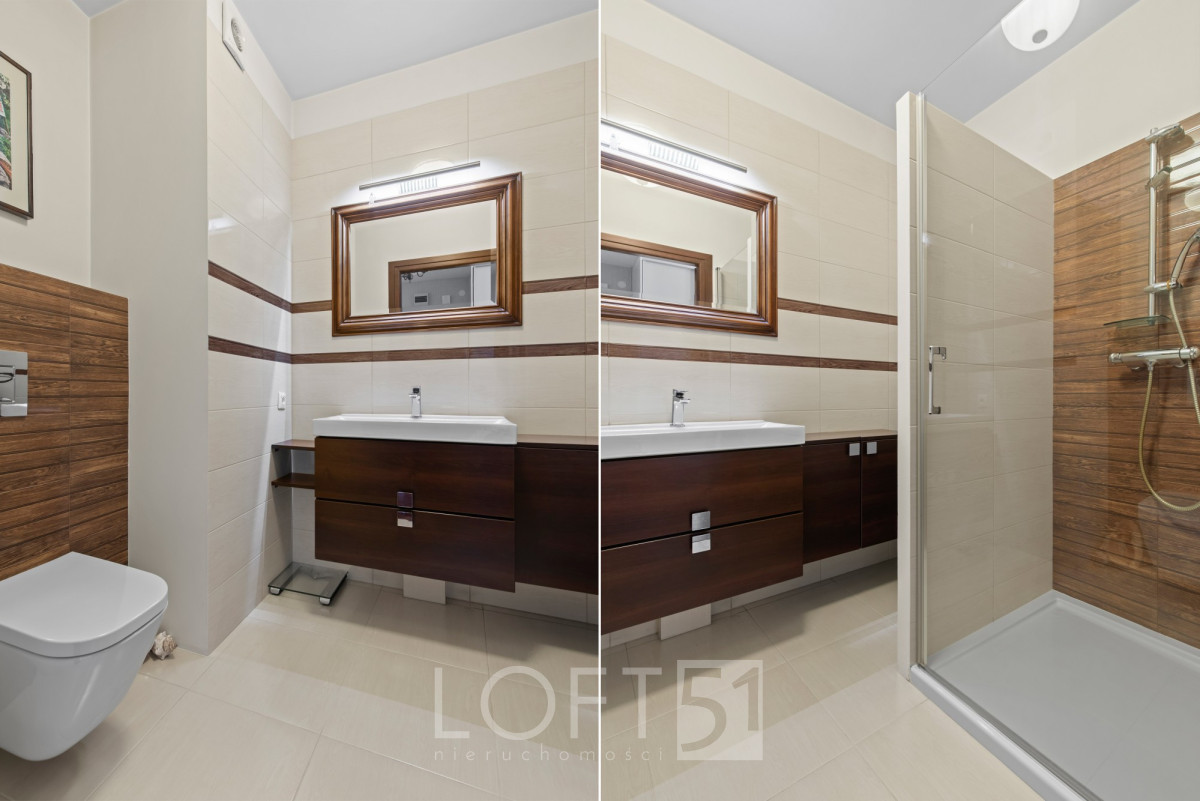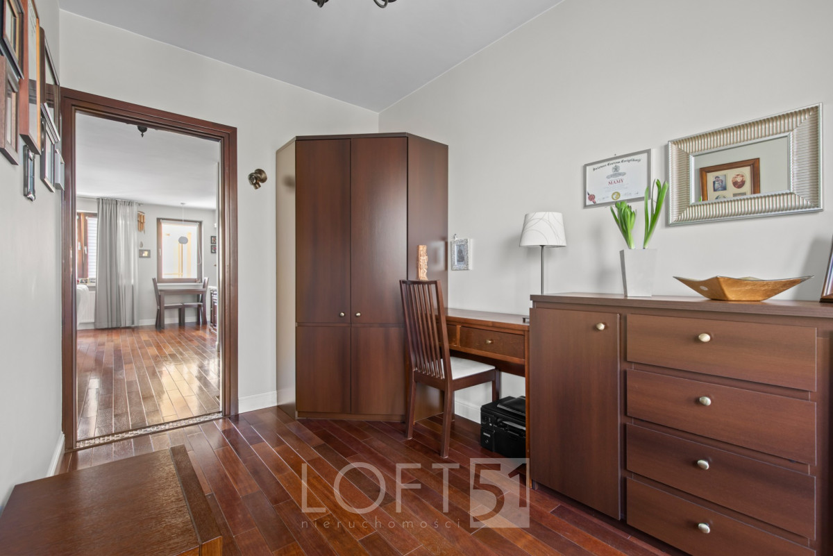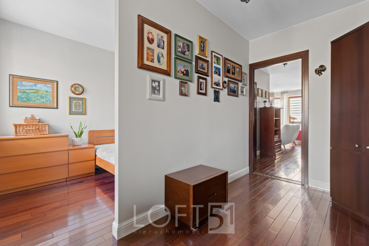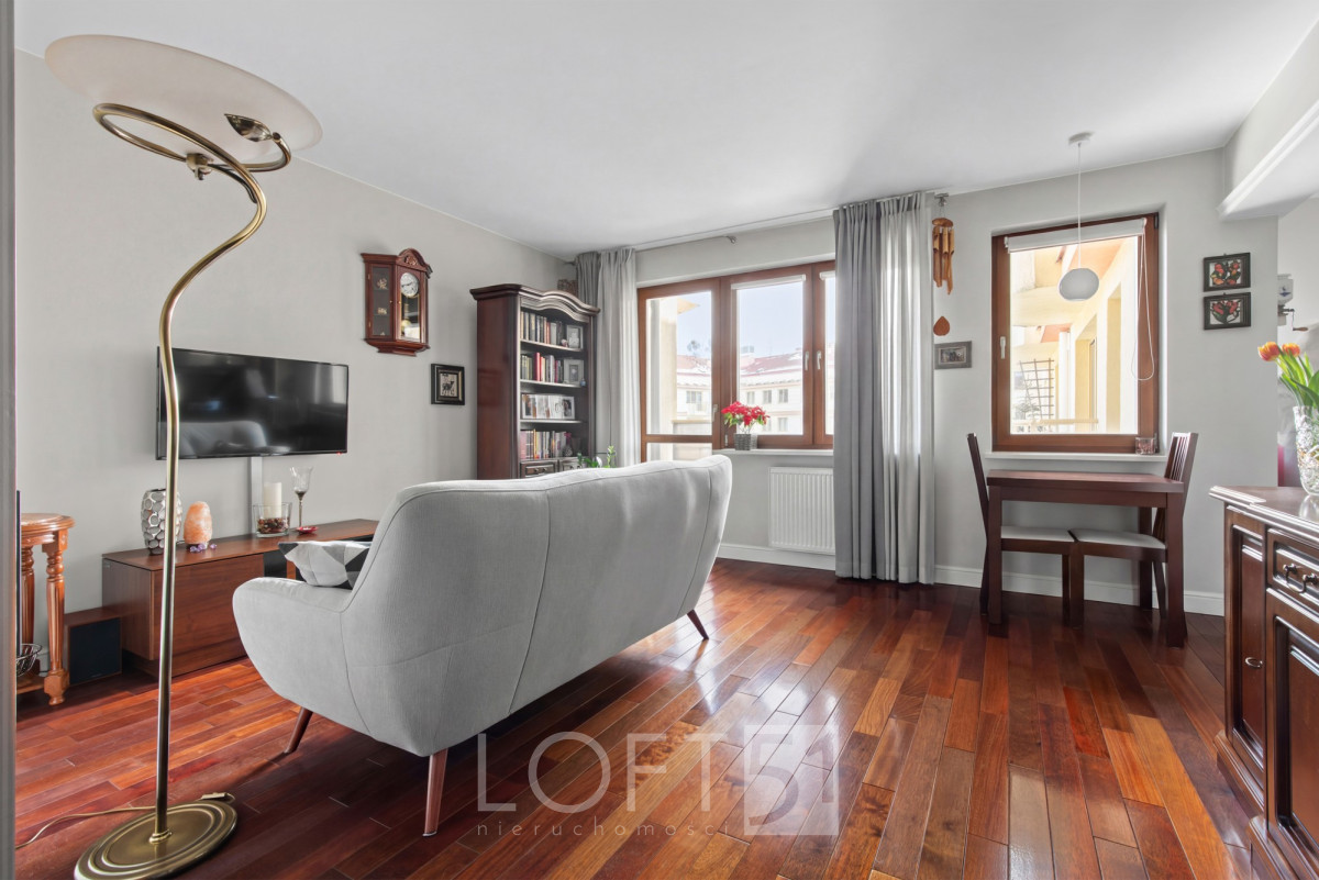 Wnętrze utrzymane w bardzo dobrym stanie, elegancko wykończone. Dwustronny układ z ekspozycją okien na północ i południe. Nieruchomość składa się z salonu, sypialni z wydzielonym gabinetem, widnej kuchni, łazienki oraz hallu. Na podłodze parkiet dębowy. Przyległości: balkon, loggia, miejsce postojowe w garażu w cenie 45000 zł.