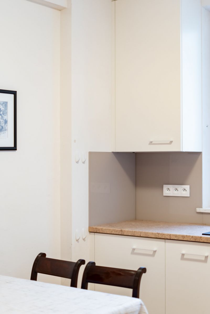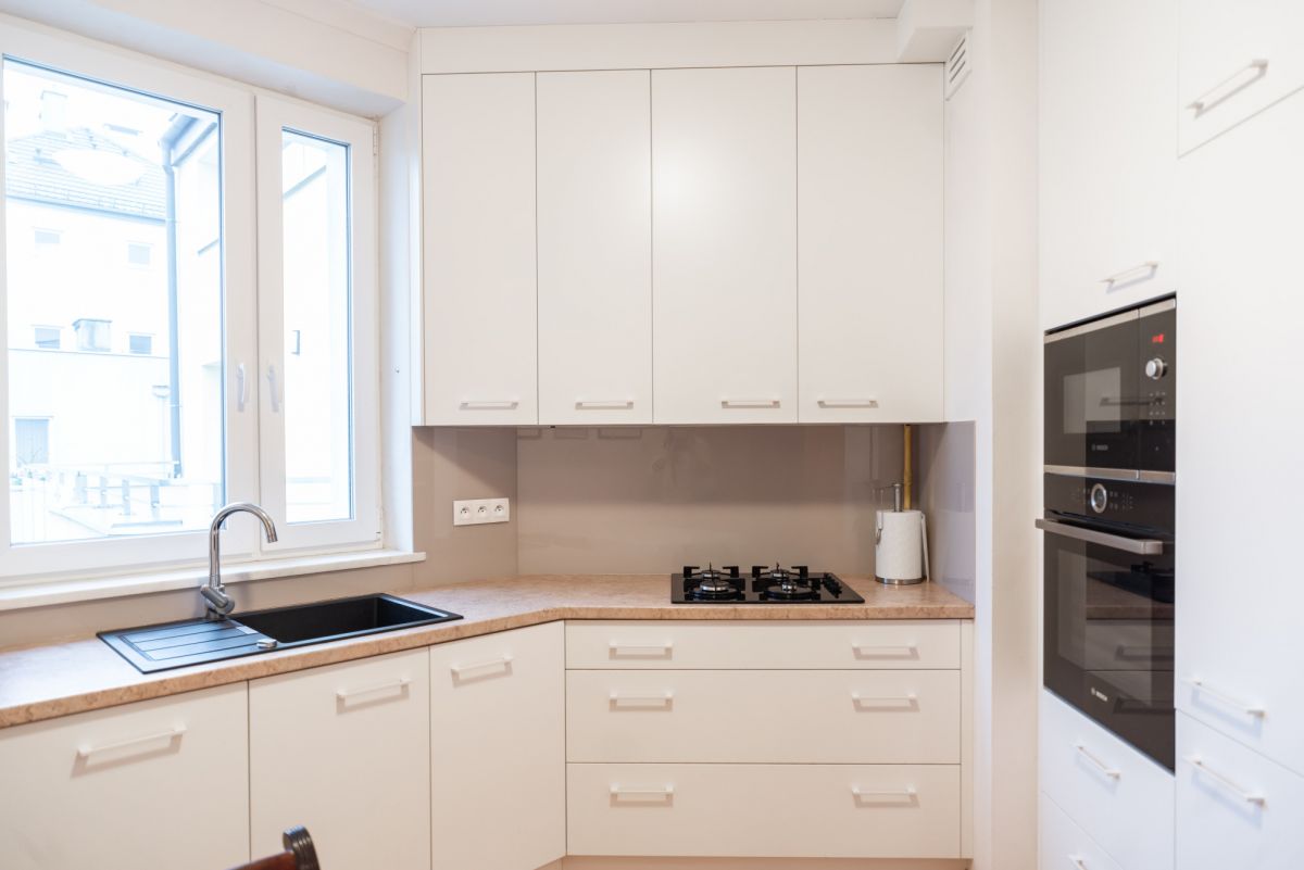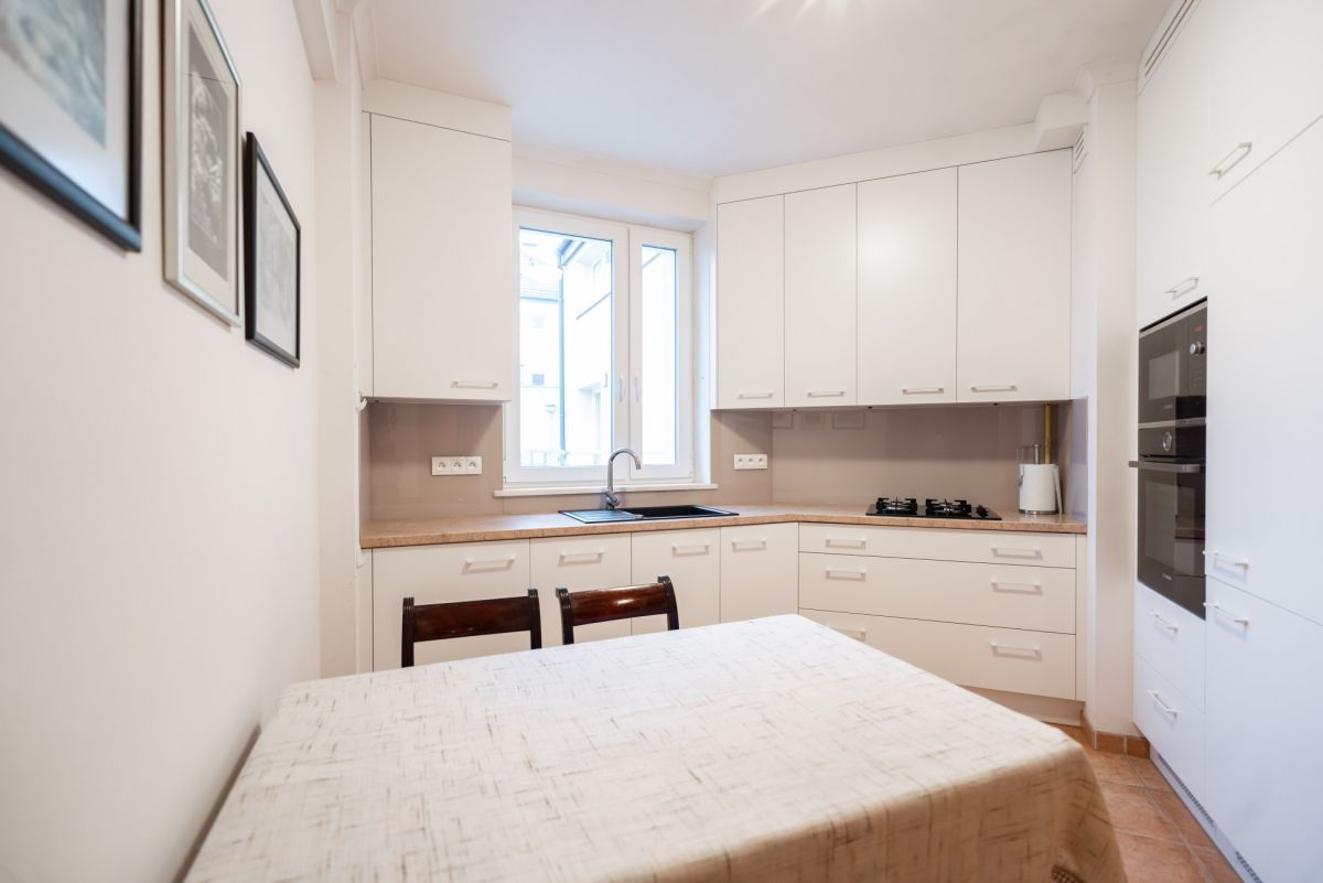 W mieszkaniu są trzy pokoje, które można zaaranżować jako salon, sypialnię główną oraz pokój dziecka, gabinet lub pokój gościnny. Taki układ dobrze sprawdzi się zarówno dla rodziny, jak i pary potrzebującej dodatkowej przestrzeni do pracy. Kuchnia jest obecnie oddzielona od salonu i tworzy serce domu, w którym toczy się codzienne życie.