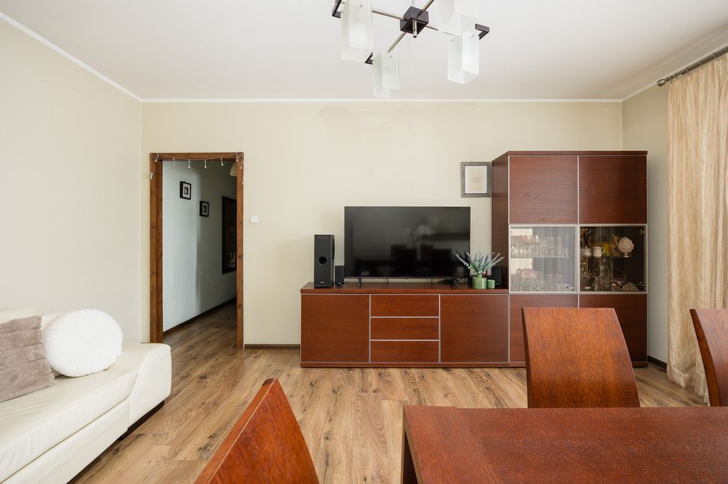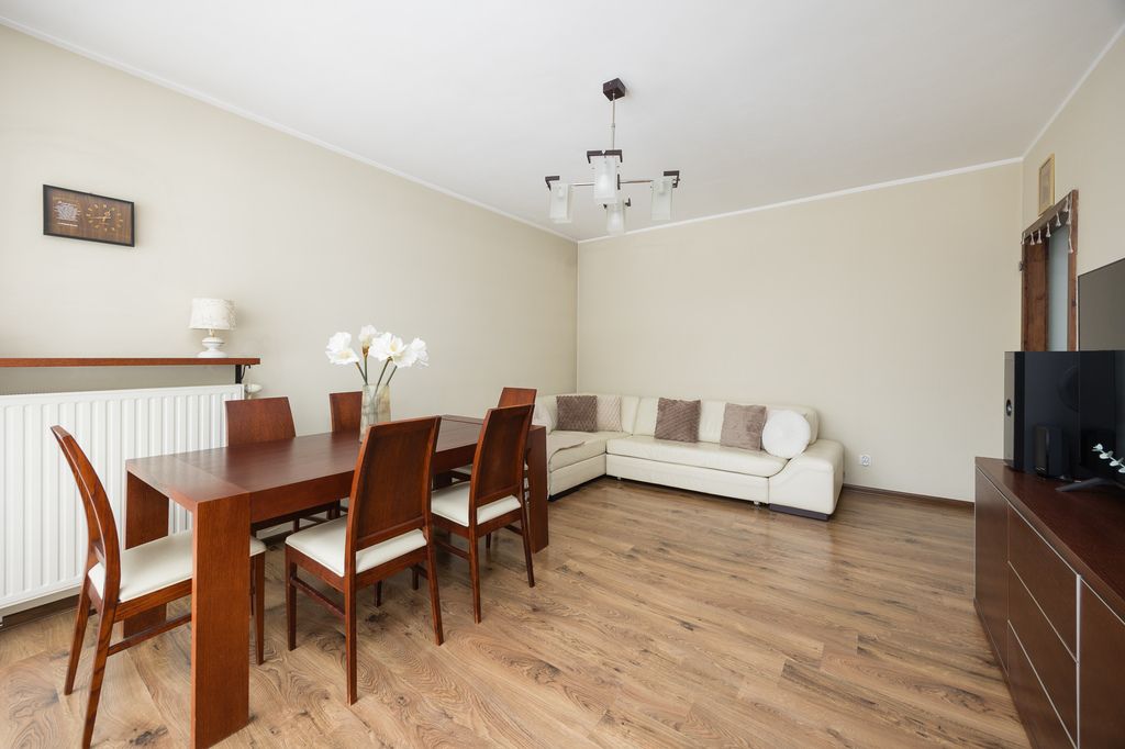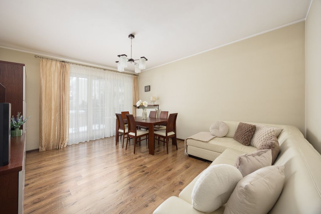Mieszkanie posiada funkcjonalny układ pomieszczeń. Balkon jest oszklony z możliwością otwarcia, co pozwala korzystać z niego przez większą część roku. Lokal jest cichy, ponieważ okna wychodzą na wewnętrzne patio z zielonym trawnikiem i zadbaną przestrzenią wspólną, oddaloną od ruchu ulicznego.