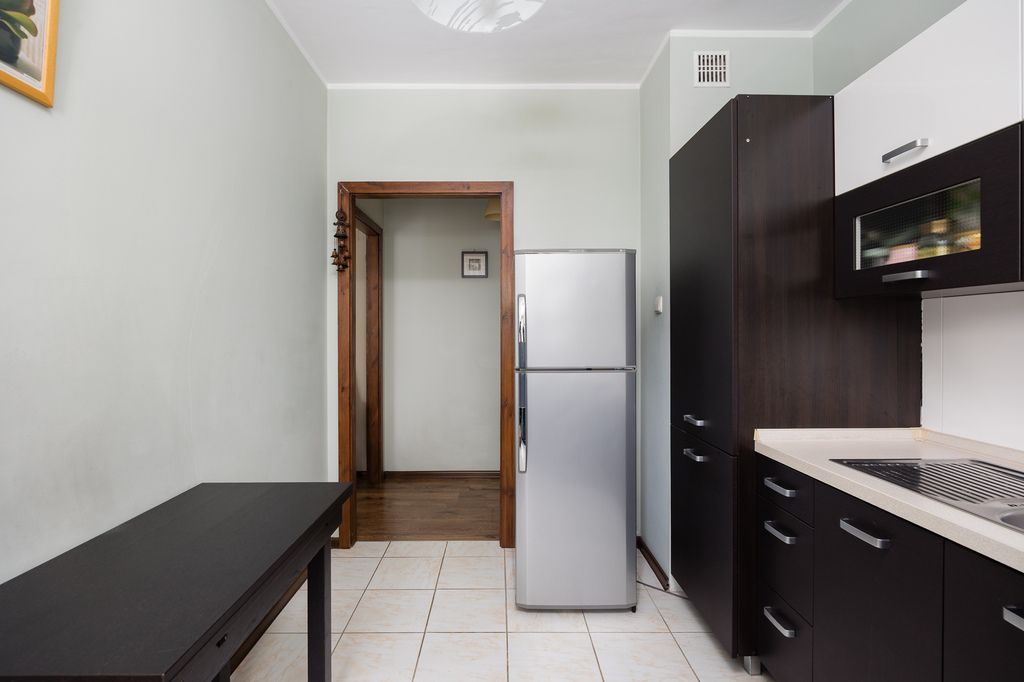 Wysokość pomieszczeń wynosi ok. 270 cm, co daje poczucie przestrzeni. Okna PCV. Na podłogach panele oraz gres. Kuchnia wyposażona w sprzęty AGD (m.in. lodówka, płyta grzewcza). Mieszkanie sprzedawane jest z umeblowaniem.