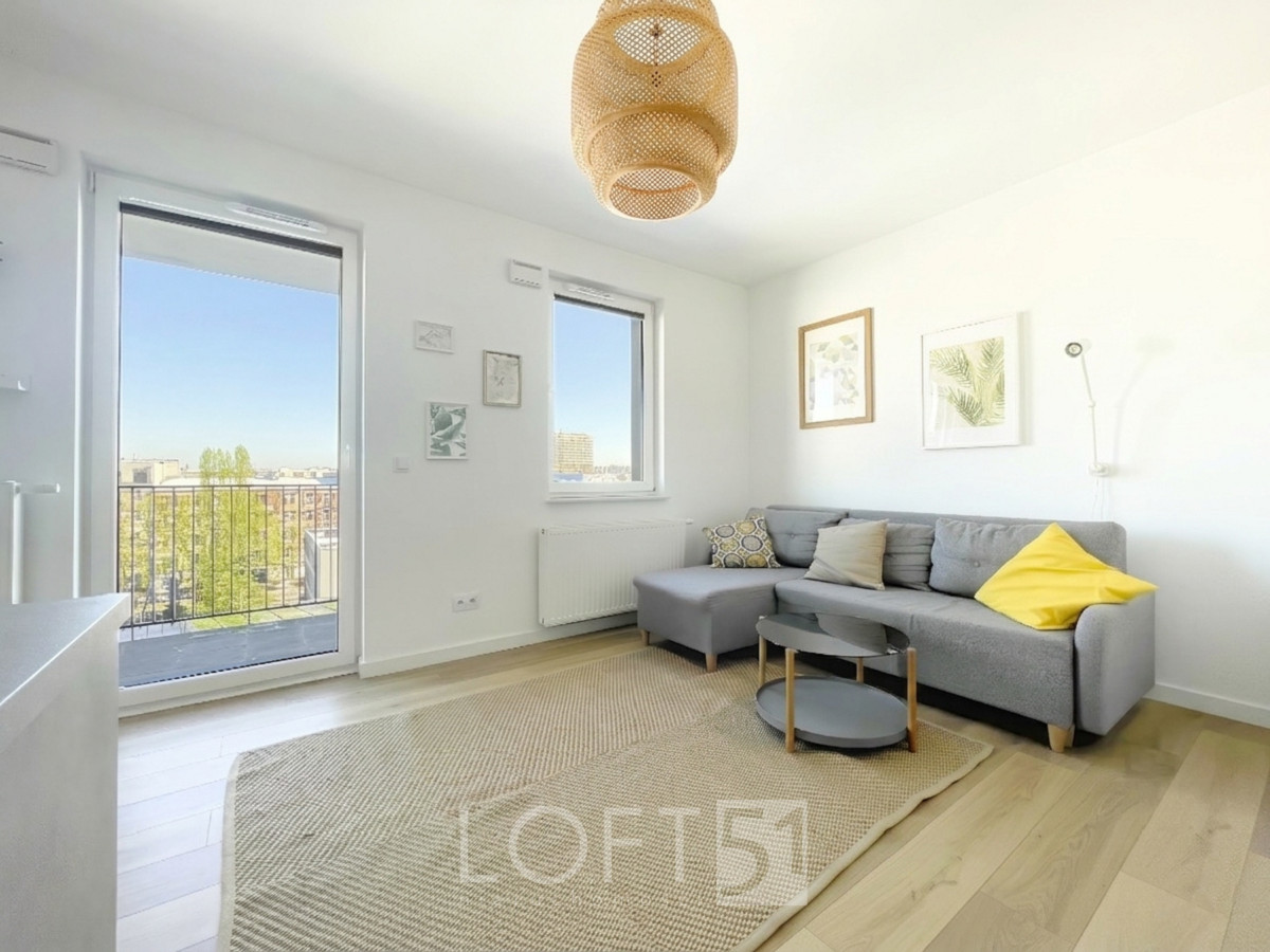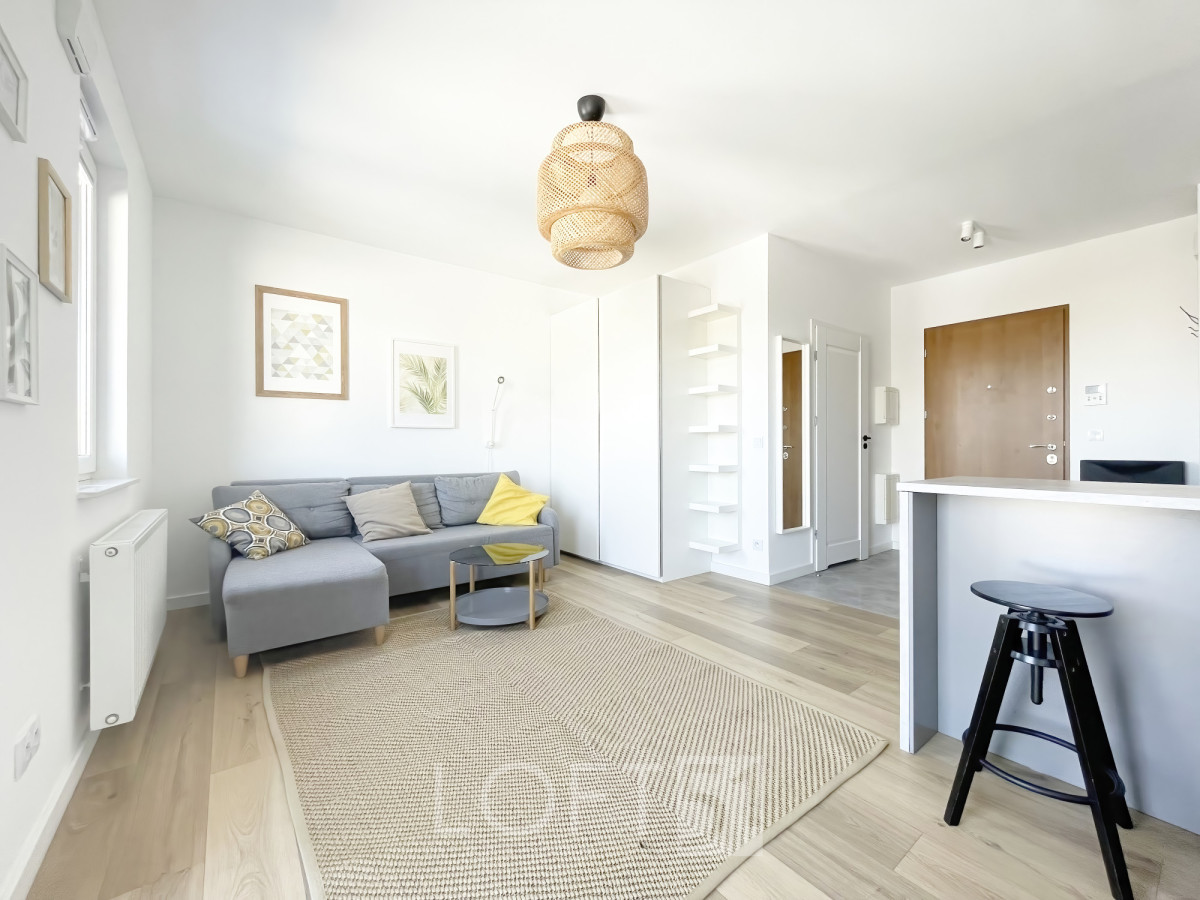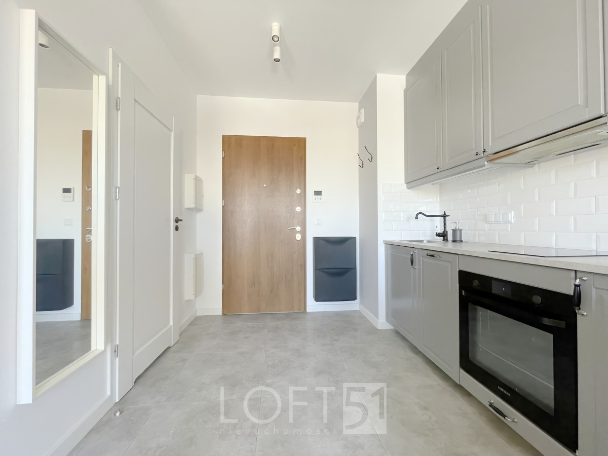 Mieszkanie zostało funkcjonalnie zaprojektowane i wykończone w bardzo dobrym standardzie. Składa się z jasnego salonu, łazienki oraz przedpokoju z aneksem kuchennym. Dzięki dużym oknom lokal jest dobrze doświetlony, a otwarta przestrzeń za oknami zapewnia poczucie prywatności.