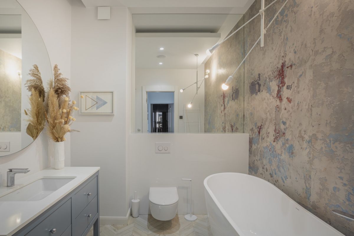 * Połączenie naturalnego drewna, cementowych płytek i dekoracyjnych tapet,