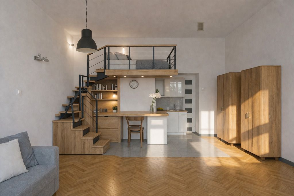 Dzięki wysokości istnieje realna możliwość wykonania antresoli (np. ok. 2,1 m na dole i 1,1 m u góry), co znacząco zwiększa funkcjonalność – zarówno do własnego użytku, jak i pod wynajem. (zdjęcie z antresolą zostało wygenerowane za pomocą AI)