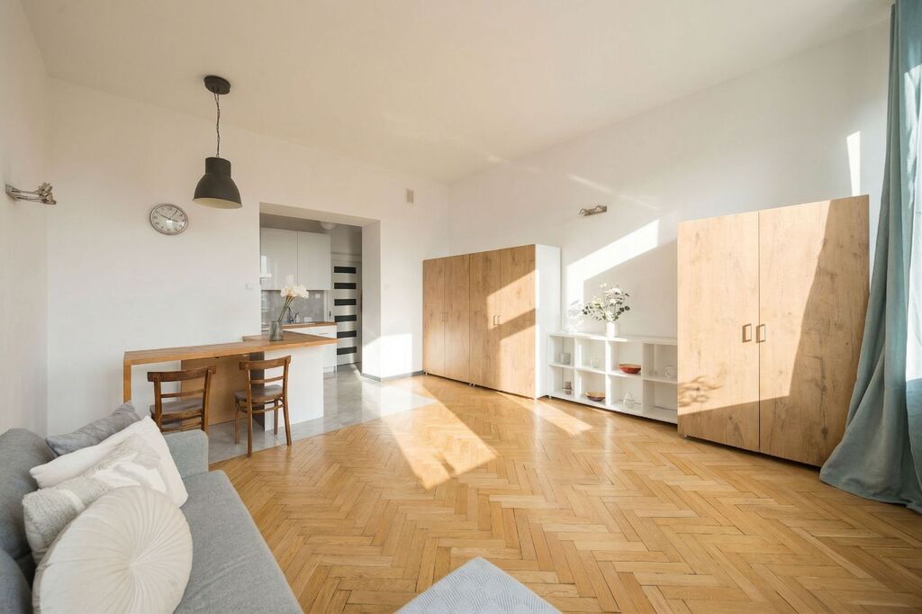 To, co wyróżnia to mieszkanie od pierwszego wejścia, to przestrzeń i klimat. Wysokość 3,3 m, duże drewniane okna i ekspozycja północno-zachodnia dają bardzo dużo światła i poczucie oddechu, którego często brakuje w nowych inwestycjach. Z okna widok na mural Szmulki Tytusa Brzozowskiego – detal, który naprawdę buduje charakter tego miejsca.
