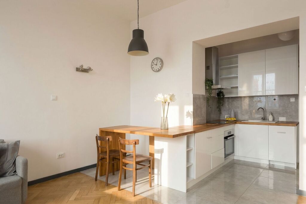 Mieszkanie jest w bardzo dobrym stanie – instalacje zostały wymienione, na podłodze parkiet i gres, wszystko spójne i z charakterem. Lokal jest umeblowany i gotowy do zamieszkania.