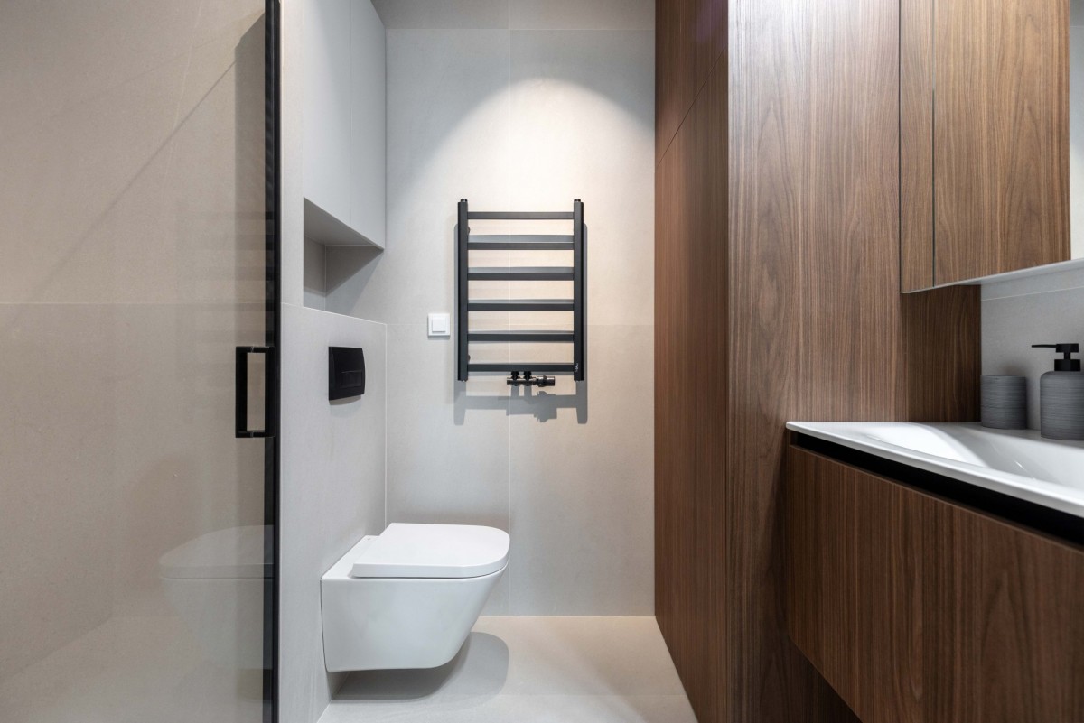 - elegancka łazienka z kabiną prysznicową i pralką,